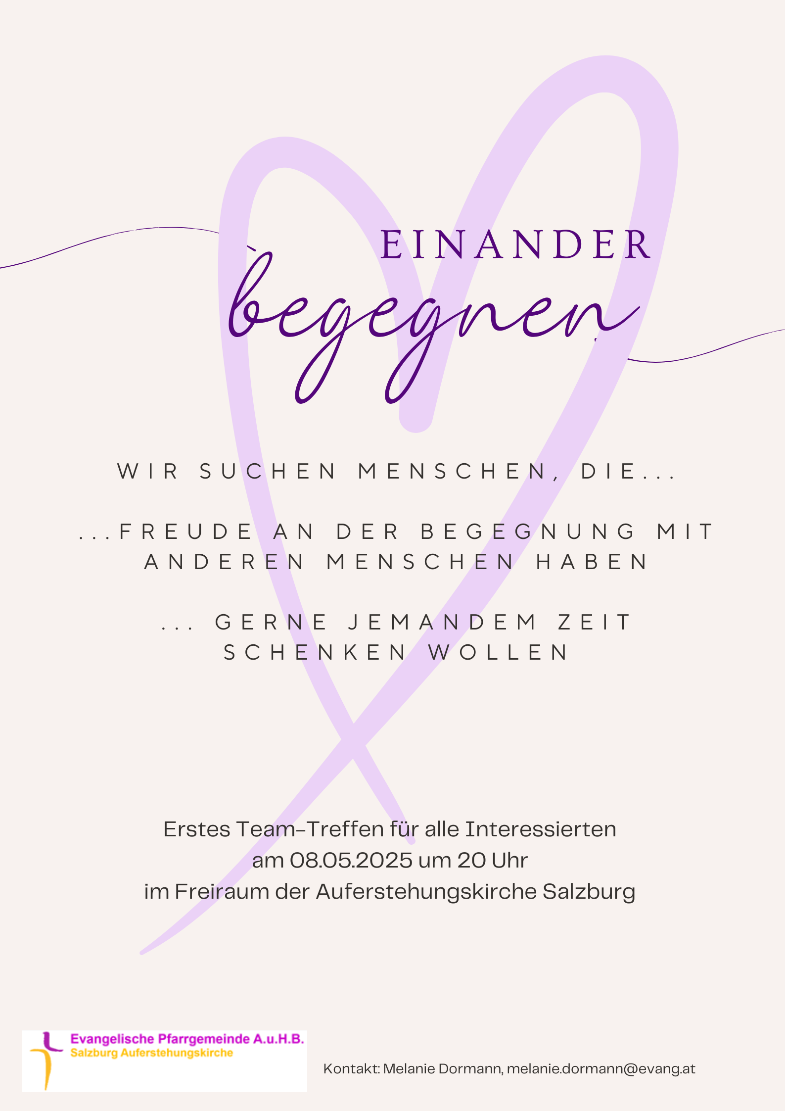 Herzliche Einladung zu einem ersten Team-Treffen am 08.05.2025 um 20 Uhr. Wir wollen uns Zeit nehmen zum Kennenlernen und Austausch, gemeinsam überlegen, wie wir dieses Projekt in unserer Gemeinde umsetzen können, damit in Zukunft viele gute Begegnungen ermöglichen können.